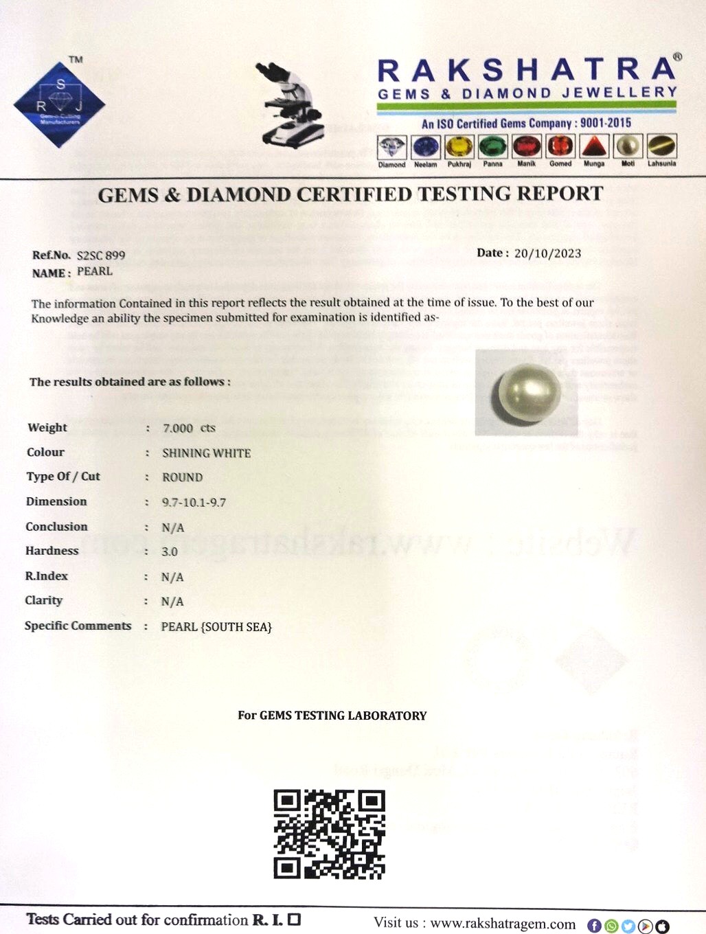 | SPECIFIC COMMENTS: | PEARL {SOUTH SEA} |