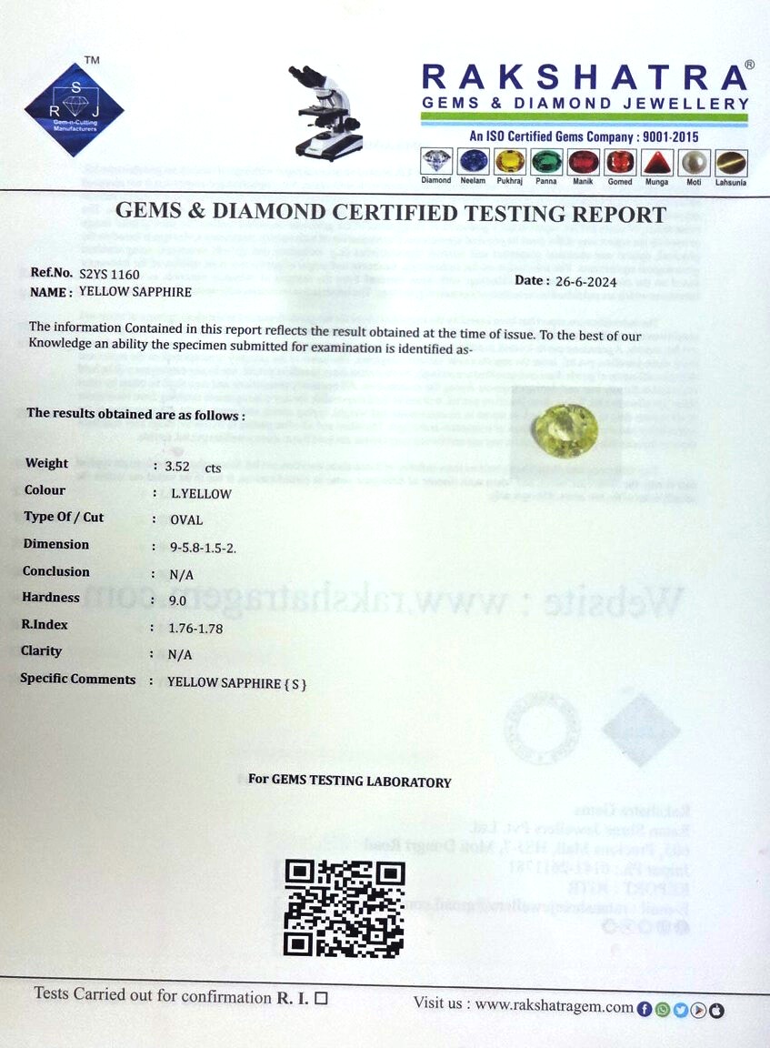 | SPECIFIC COMMENTS: | YELLOW SAPPHIRE { S } |