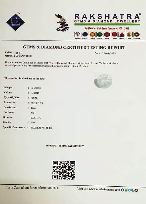 | SPECIFIC COMMENTS: | BLUE SAPPHIRE { S } |