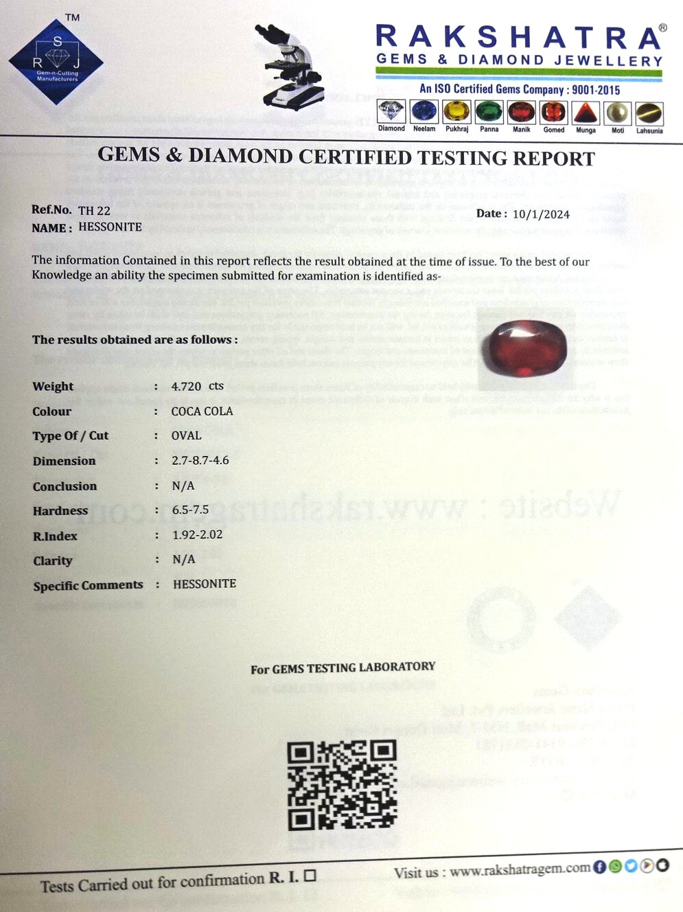 | SPECIFIC COMMENTS: | HESSONITE |