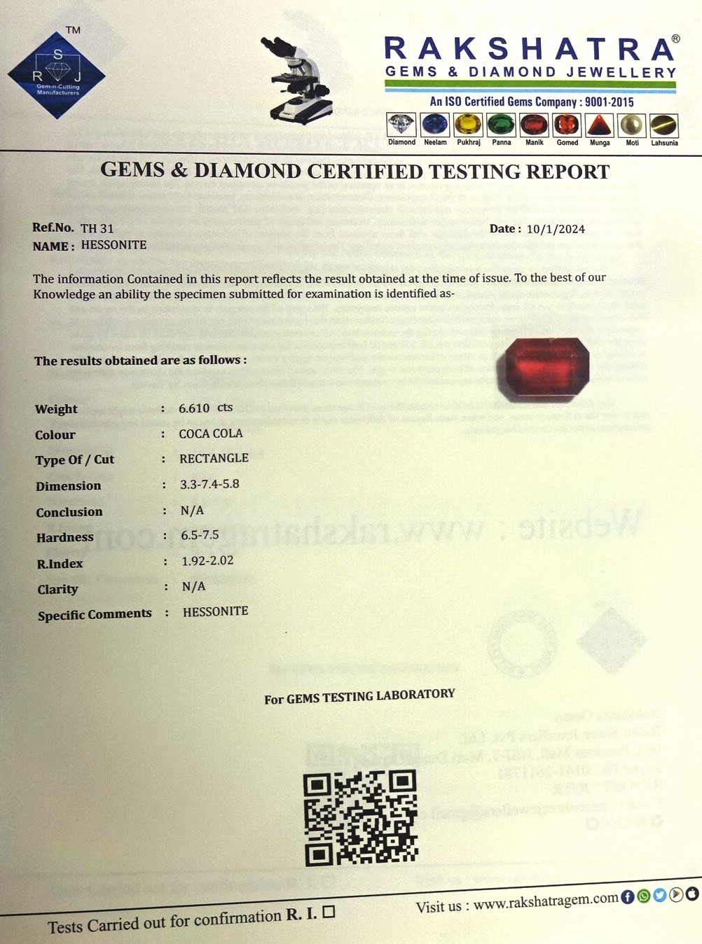 | SPECIFIC COMMENTS: | HESSONITE |