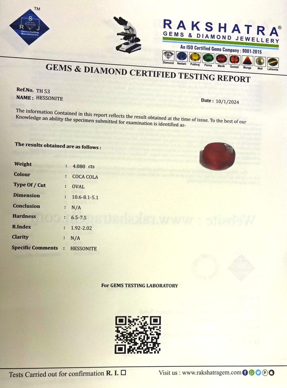 | SPECIFIC COMMENTS: | HESSONITE |