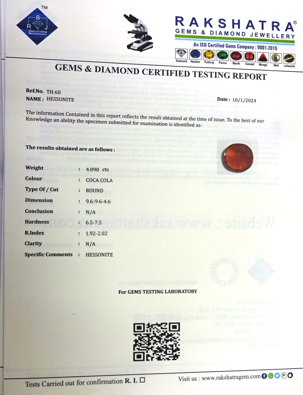 | SPECIFIC COMMENTS: | HESSONITE |