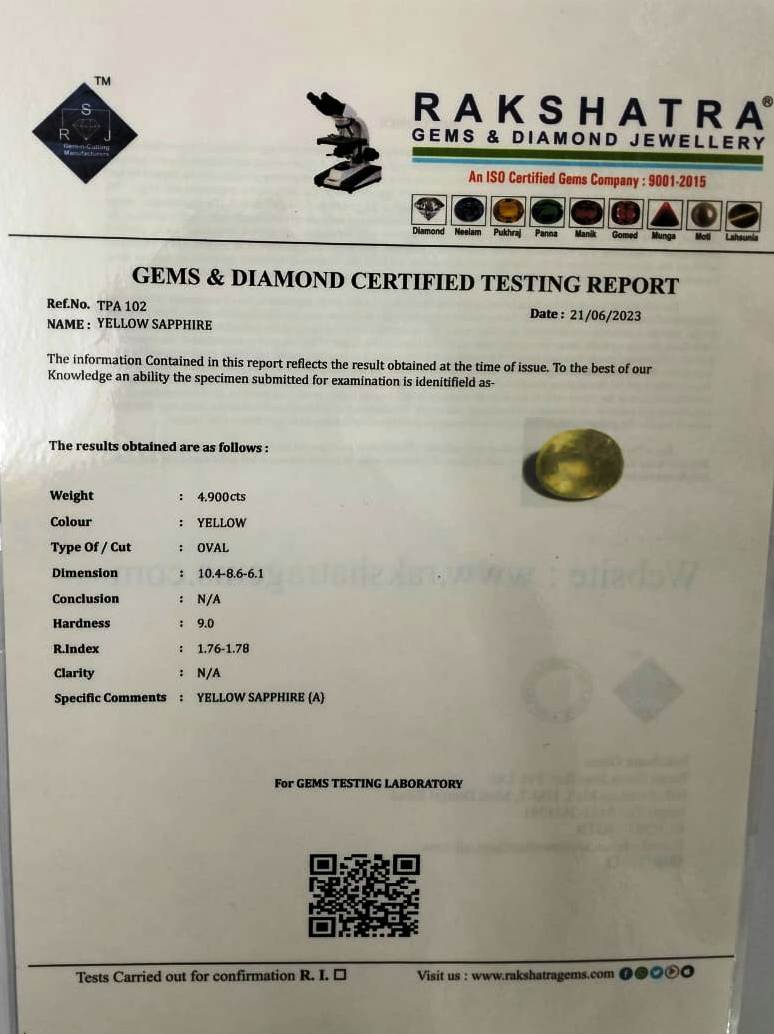 | SPECIFIC COMMENTS: | YELLOW SAPPHIRE { A } |