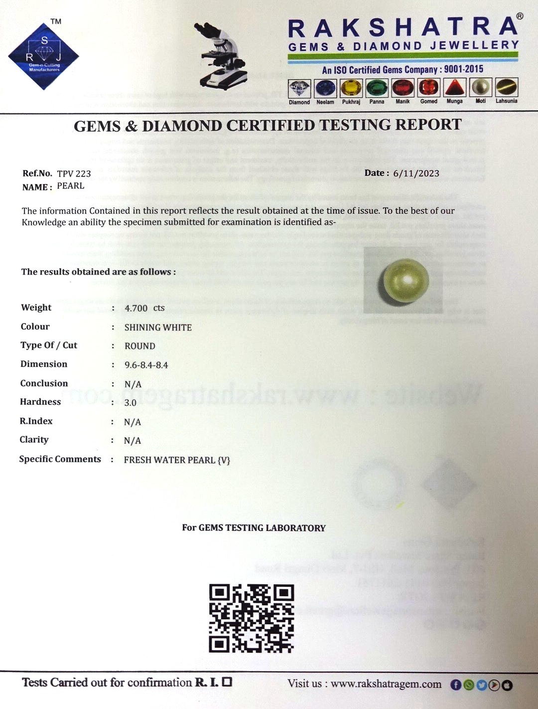 | SPECIFIC COMMENTS: | FRESH WATER PEARL { V } |