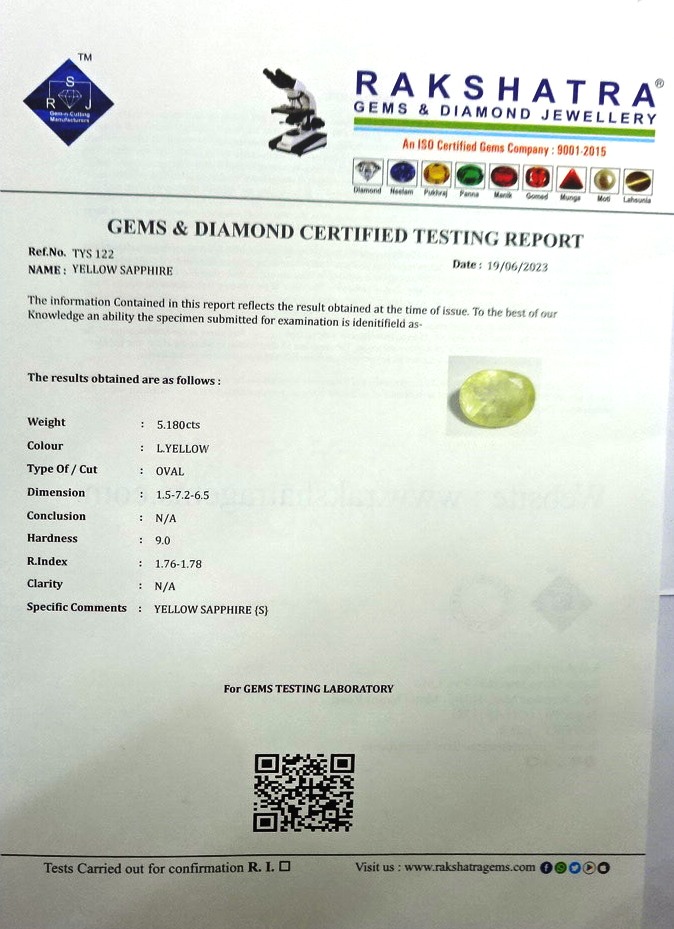 | SPECIFIC COMMENTS: | YELLOW SAPPHIRE { S } |