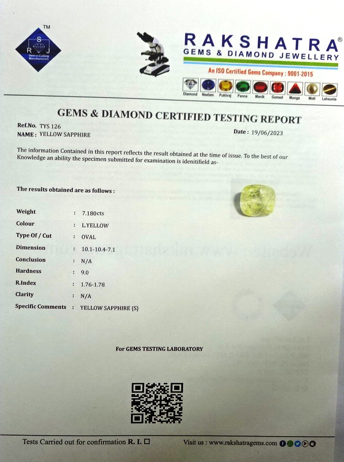 | SPECIFIC COMMENTS: | YELLOW SAPPHIRE { S } |