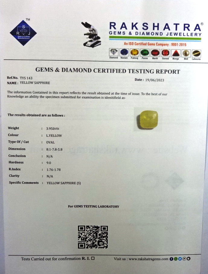 | SPECIFIC COMMENTS: | YELLOW SAPPHIRE { S } |